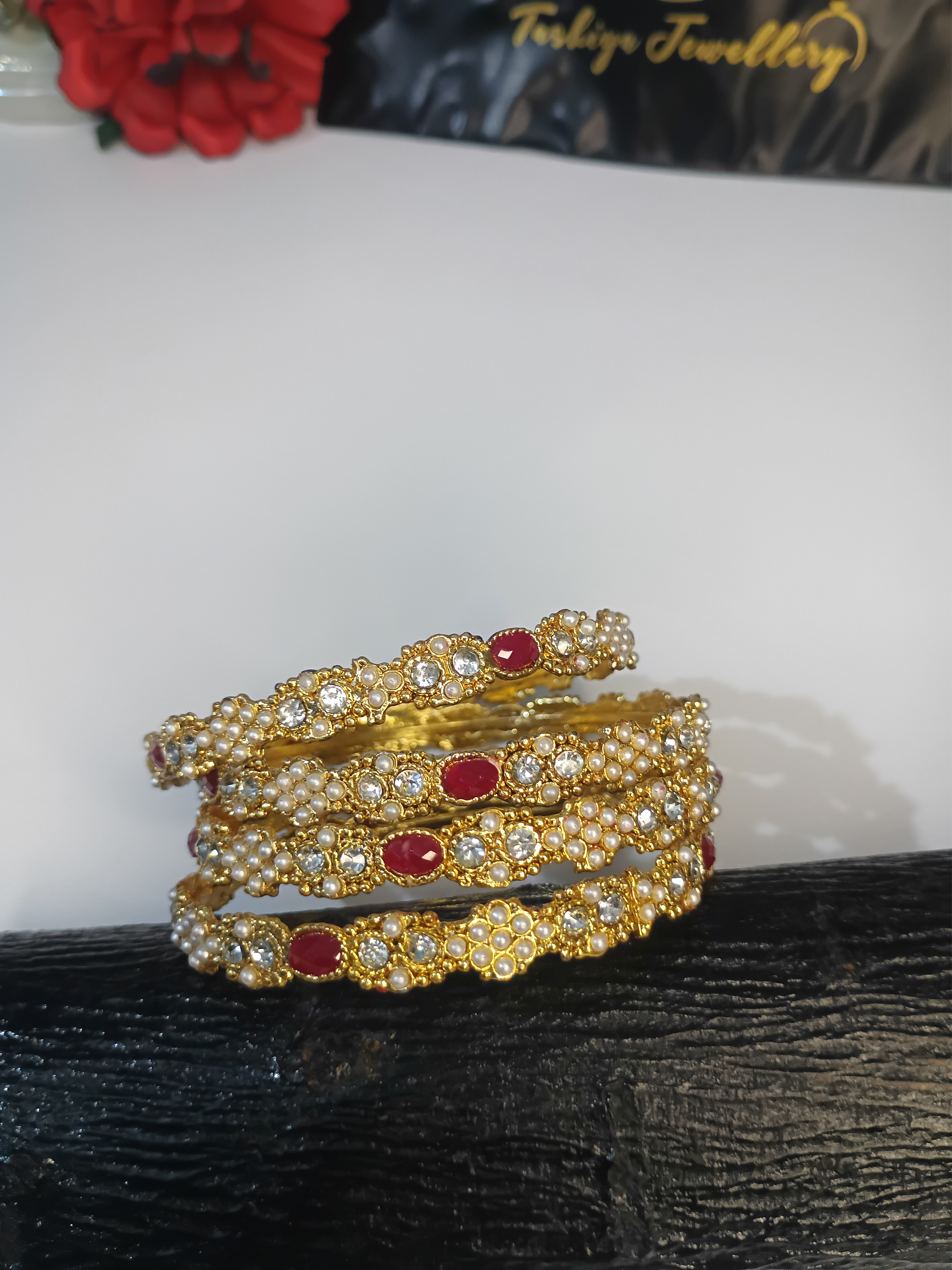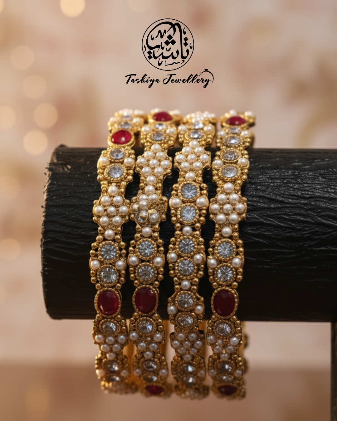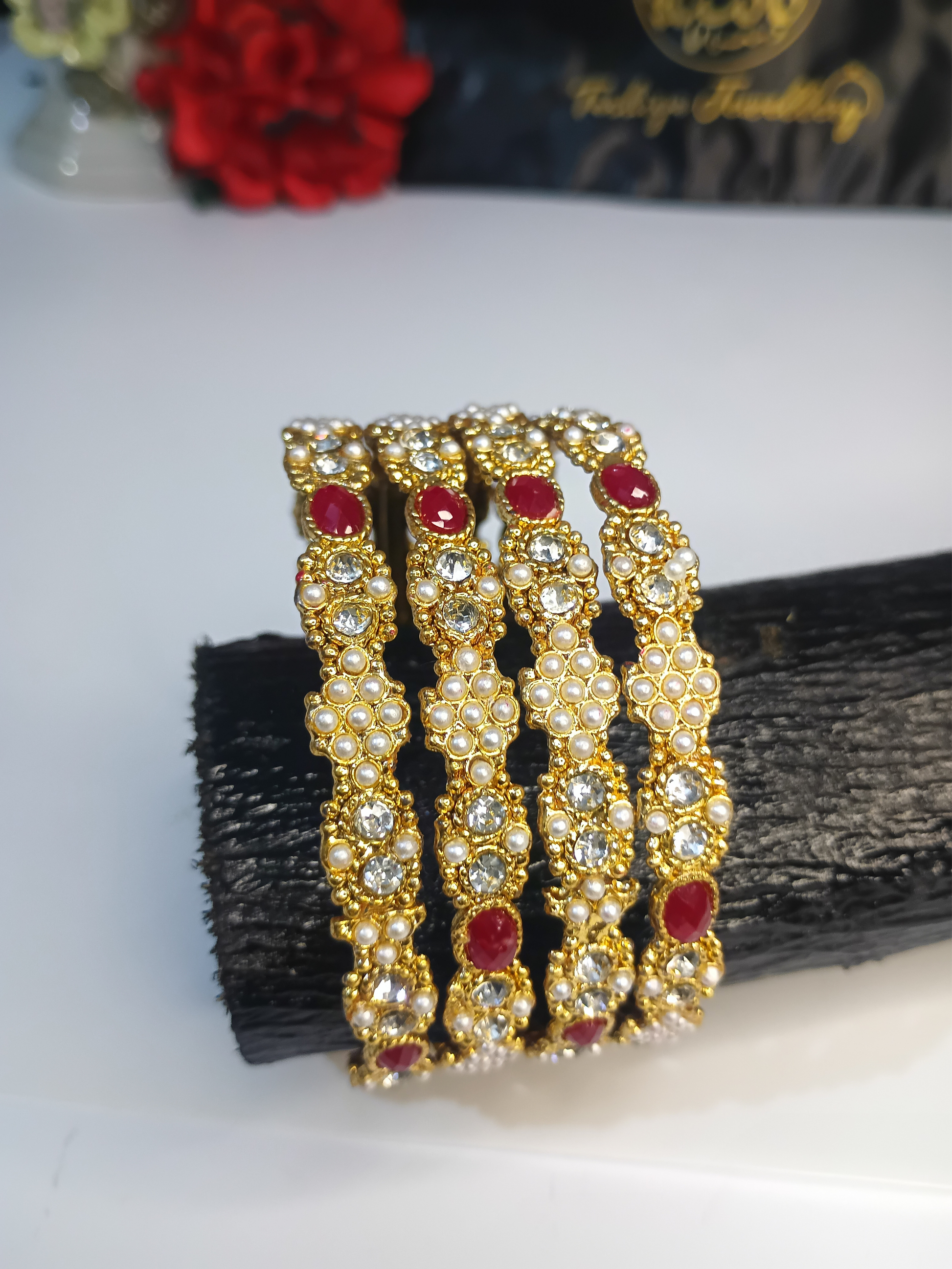 These stunning bangles, crafted from Sikka material, radiate elegance with their intricate floral design. Embellished with brilliant white stones, shimmering like pearls, and deep red oval gemstones, they create a striking contrast that enhances their regal appeal. The delicate gold-plated framework intricately weaves each stone together, making these bangles a perfect blend of tradition and sophistication. Ideal for weddings, festive occasions, or adding a statement touch to any outfit!