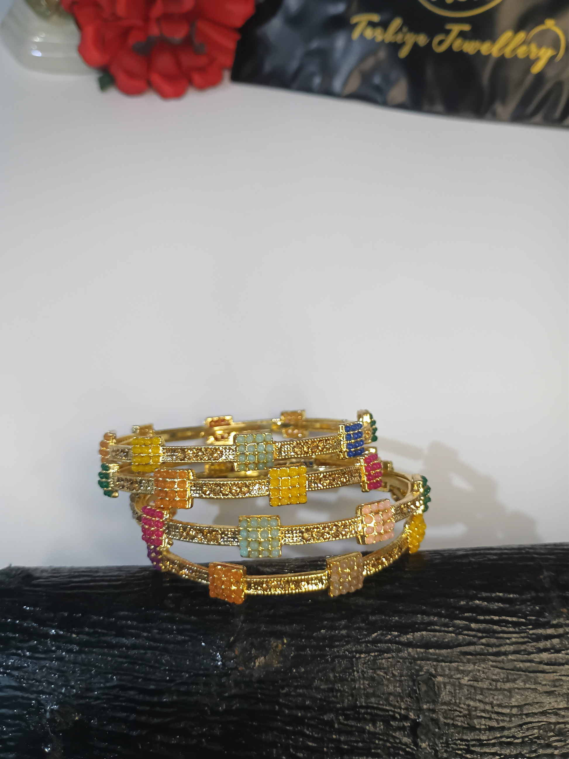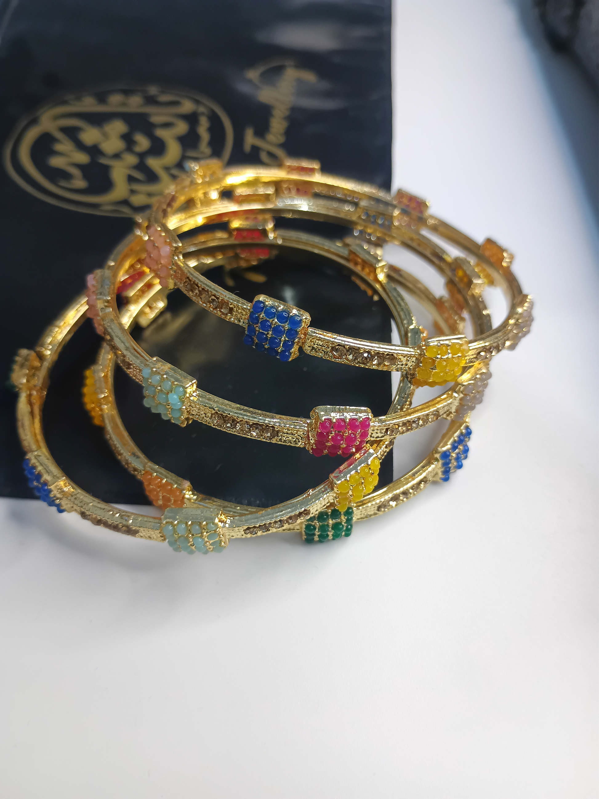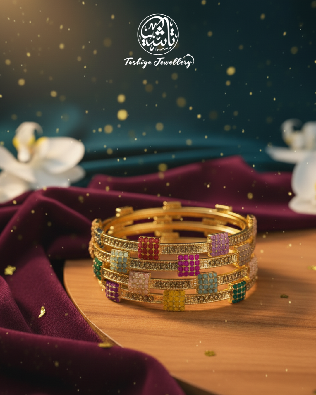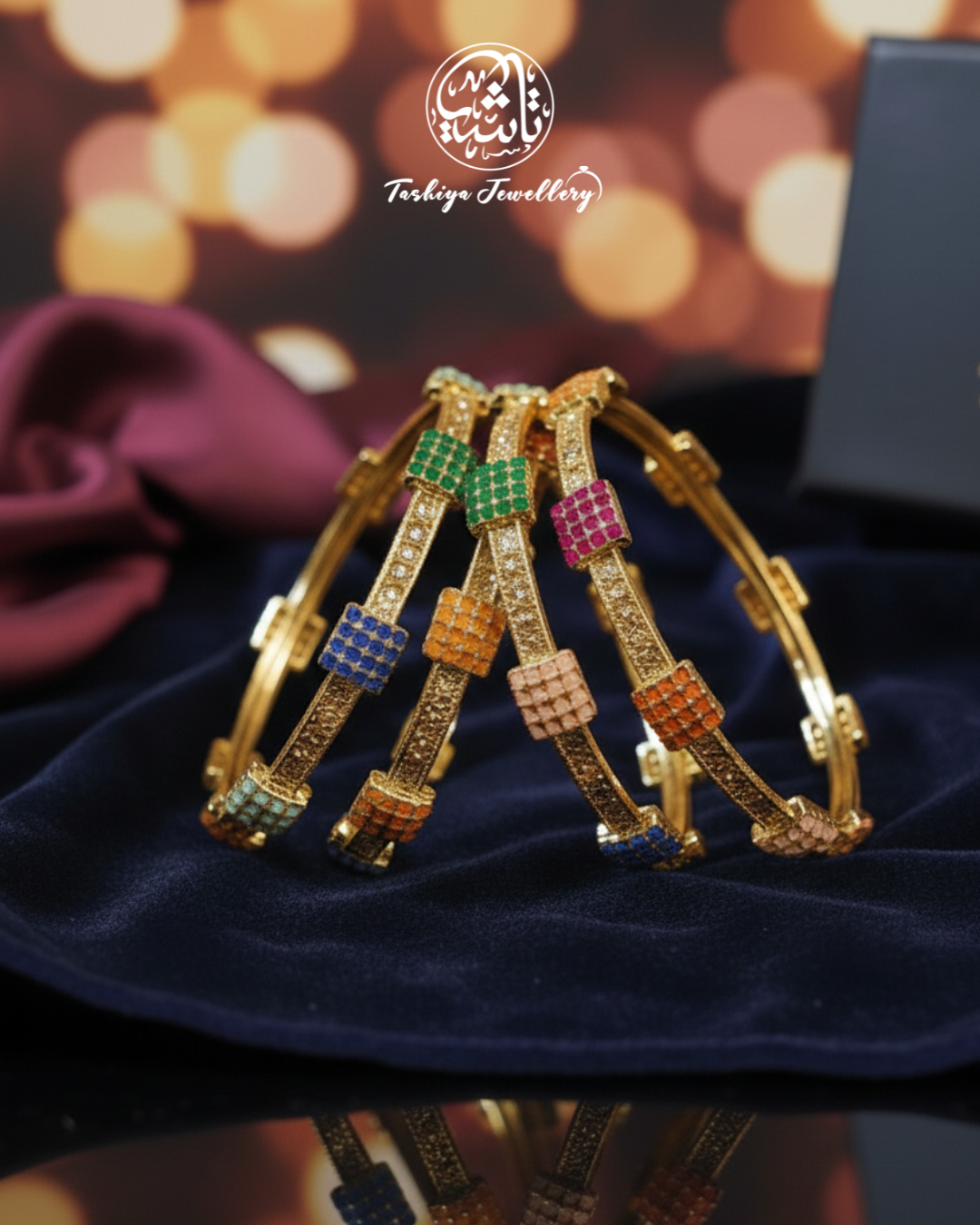 Tashiya Jewellery presents exquisite handcrafted bangles, adorned with vibrant multicolored cubic embellishments and shimmering stones on a gold-toned base. A perfect blend of tradition and elegance, these kada add a touch of luxury to any occasion.