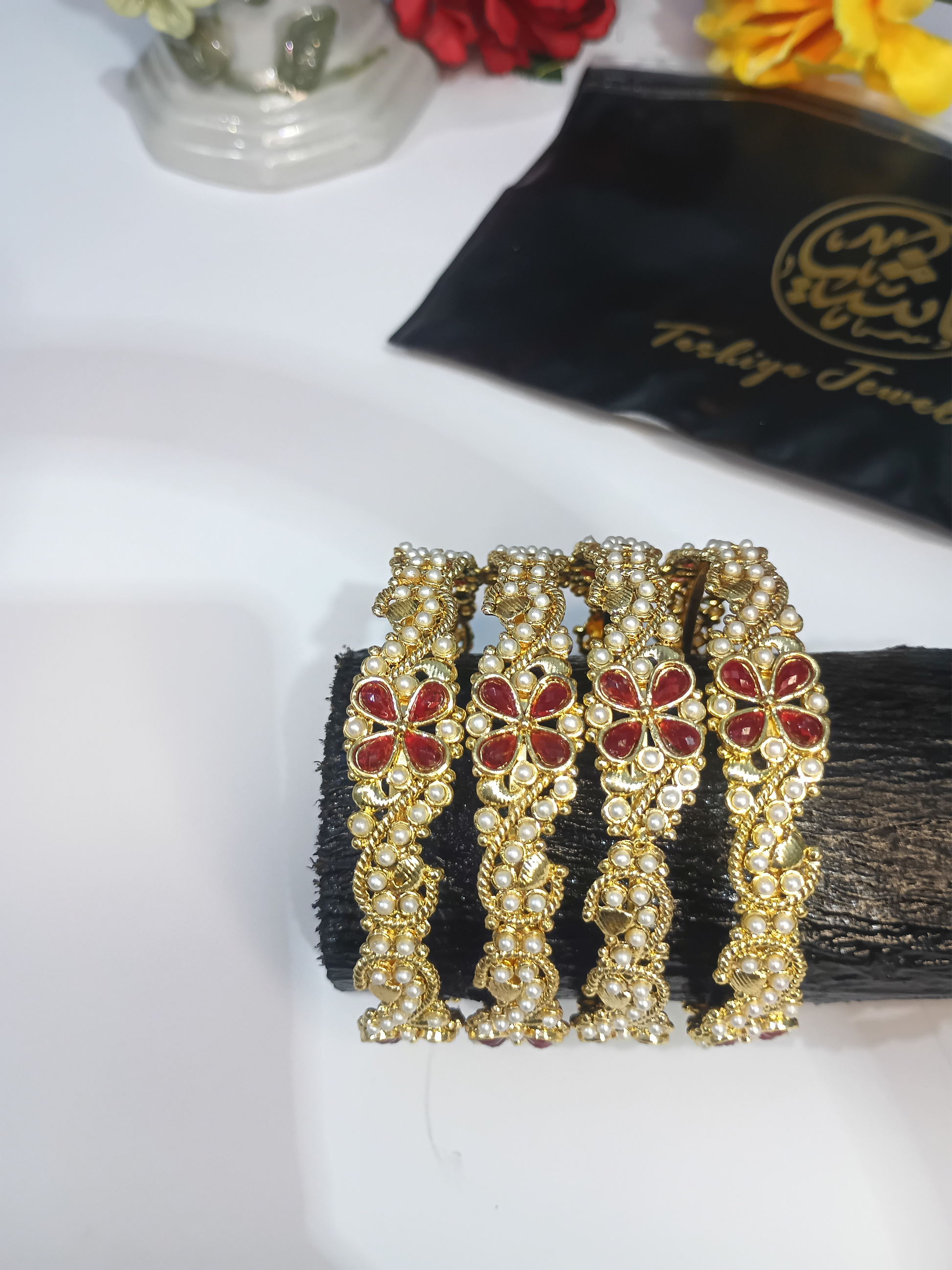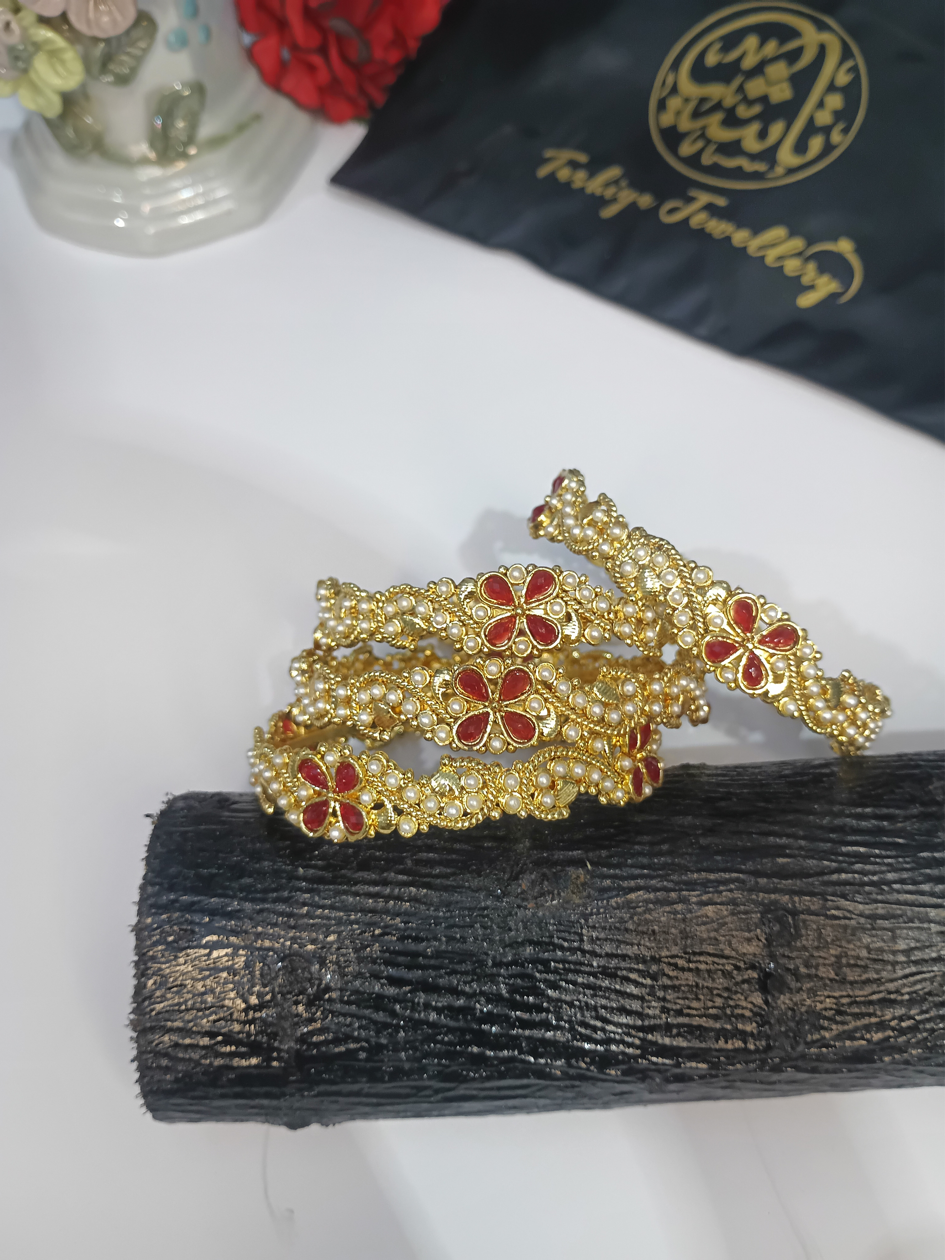 Tashiya Jewellery presents these stunning gold-toned bangles, intricately designed with a floral motif at the center, adorned with deep red petals. The delicate arrangement of pearls enhances the overall elegance, creating a luxurious and regal appeal. The twisted design along the band adds a touch of uniqueness, making these kangan a perfect choice for weddings, festive occasions, and grand celebrations. Their exquisite craftsmanship and rich detailing make them a timeless addition to any jewelry collection.