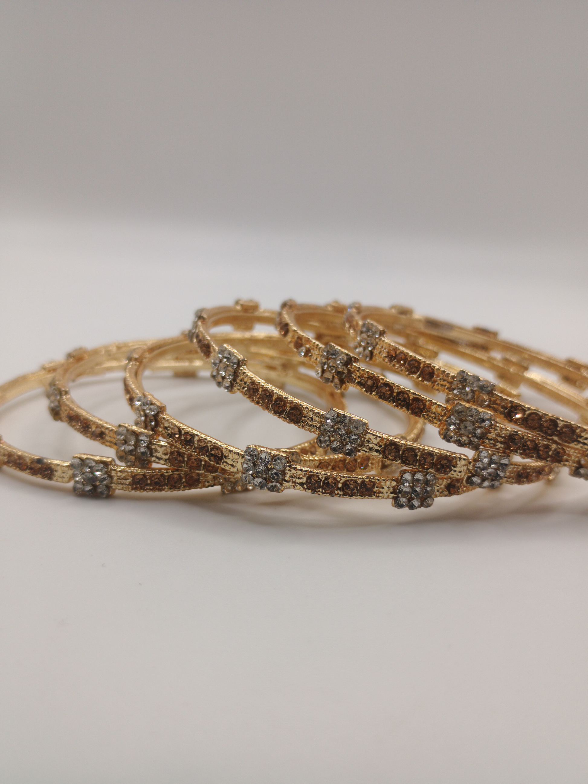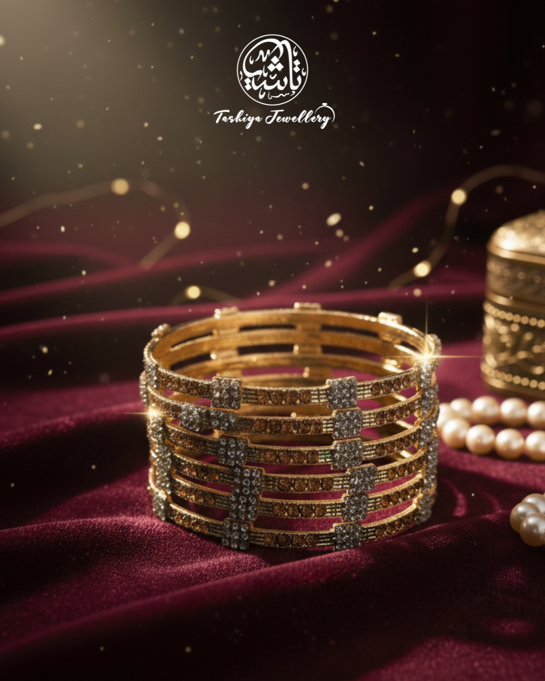 This set showcases six broad bangles, each piece intricately decorated with rows of small, round, white stones and tiny gold beadwork. The main attraction is the pattern of white and gold stones, set intermittently to create a regal, jewel-encrusted look. The craftsmanship is highly detailed, blending traditional filigree with a sparkling contemporary feel, making it a perfect statement piece for wedding ceremonies, formal gatherings, and festive occasions.