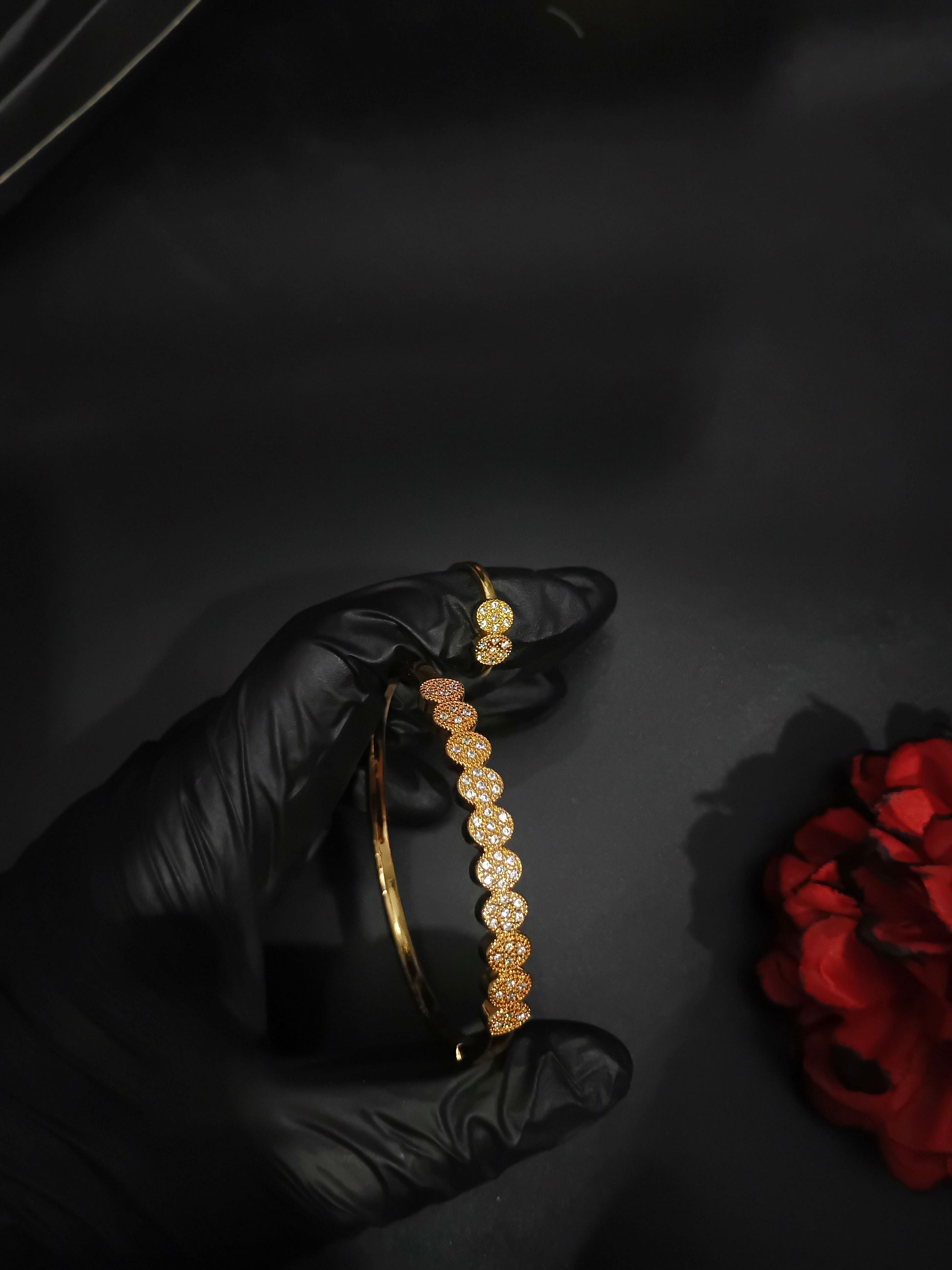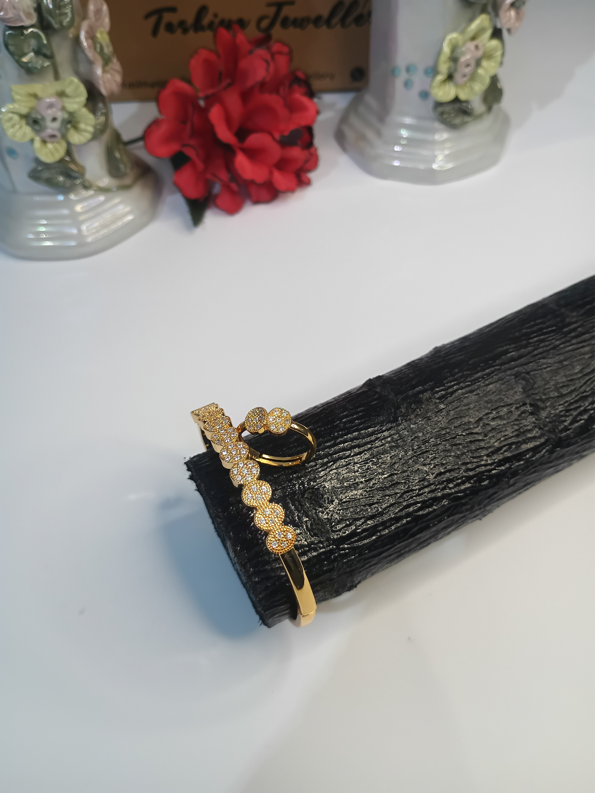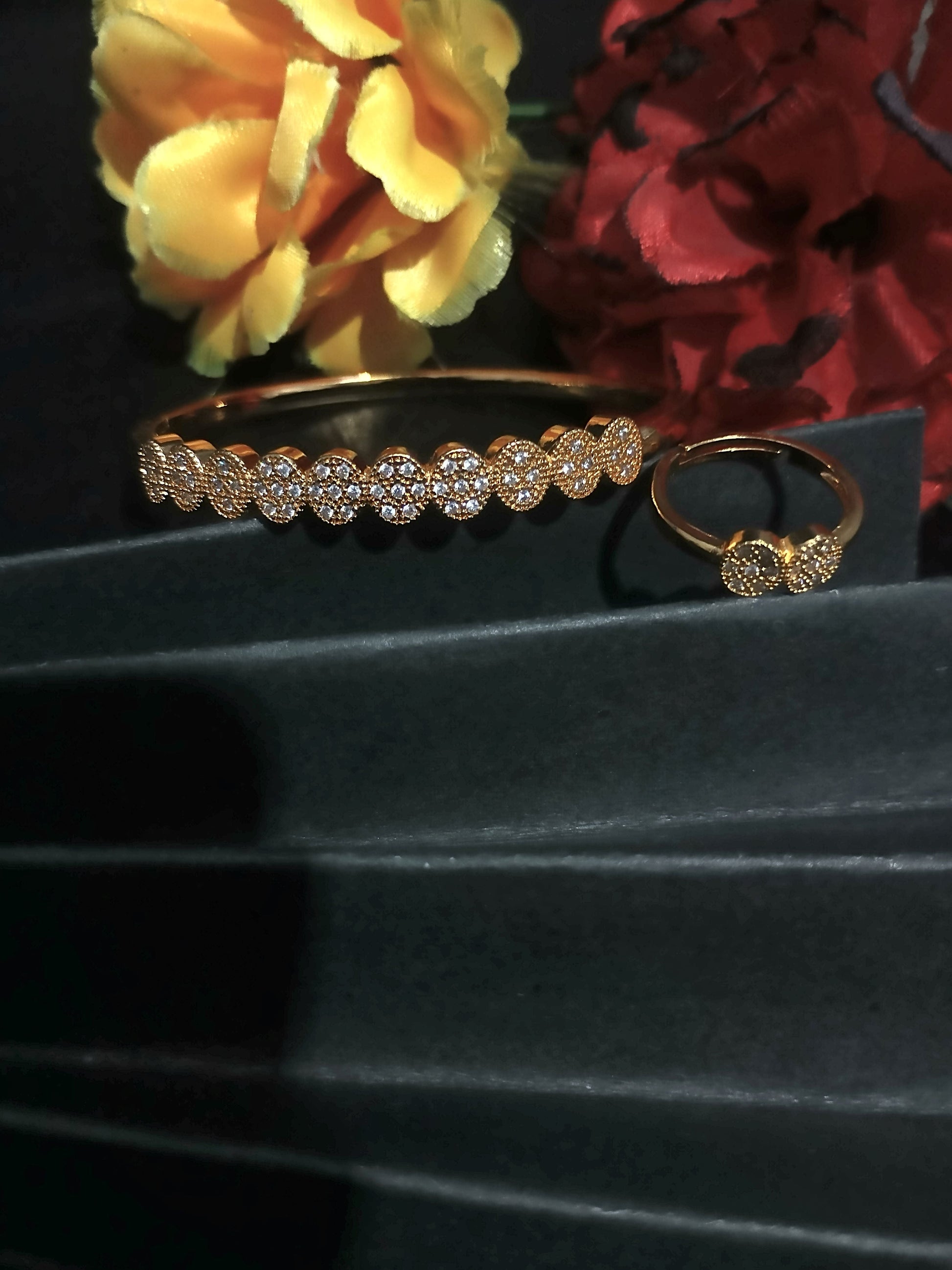 Elegant Gold-Plated Bracelet & Ring SetAdd a touch of timeless elegance to your look with this beautifully handcrafted gold-plated bracelet and matching ring. Featuring a stunning circular design encrusted with sparkling cubic zirconia stones, this set captures both luxury and tradition. The bracelet's sleek structure and intricate detailing make it perfect for both formal occasions and festive wear. Paired with a matching statement ring, this duo exudes sophistication and grace. A perfect addition to your jewellery collection or a heartfelt gift for someone special.