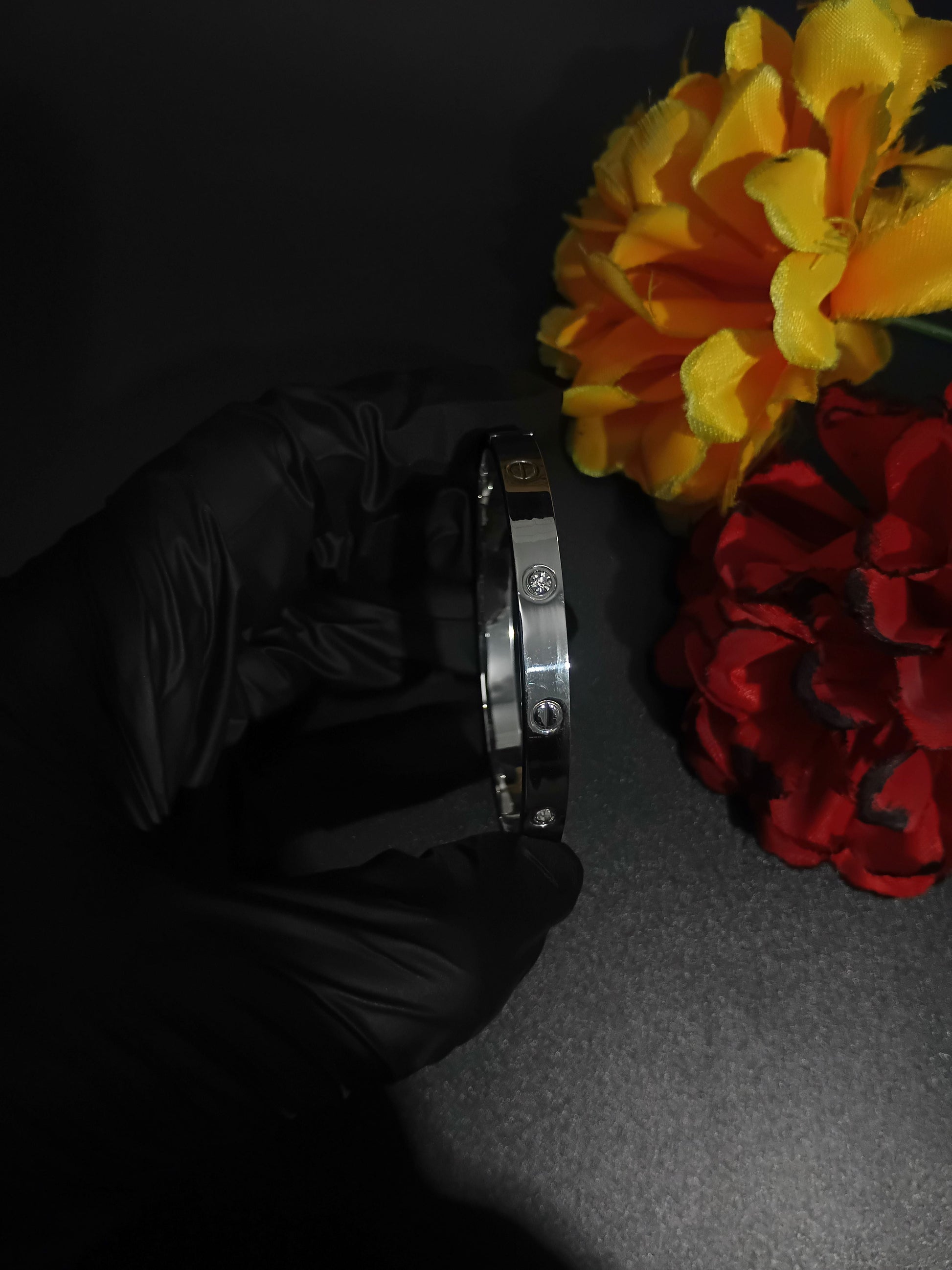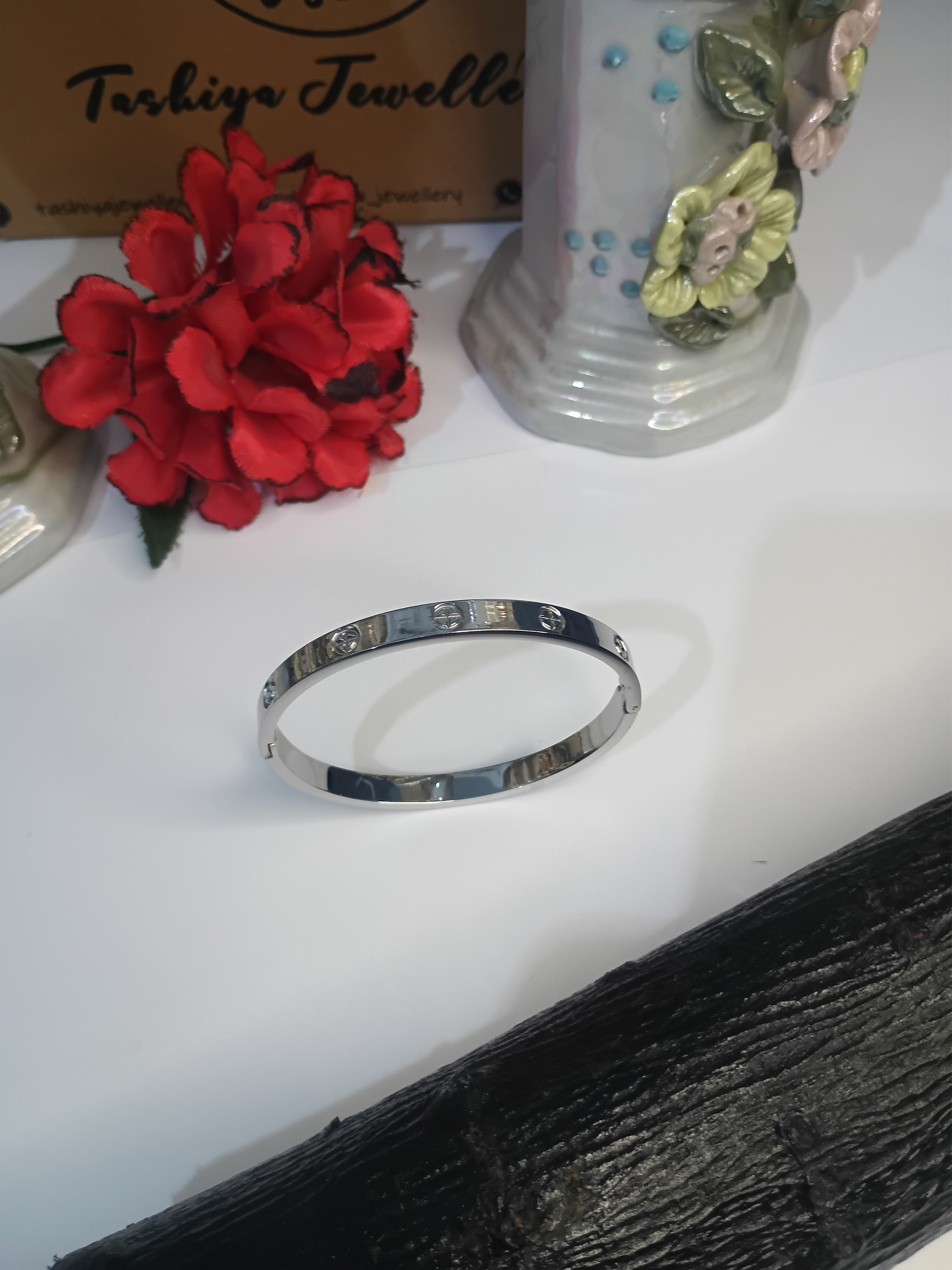 Sleek metallic bracelet with a polished finish, accented by bezel-set stones for a modern, luxurious look.