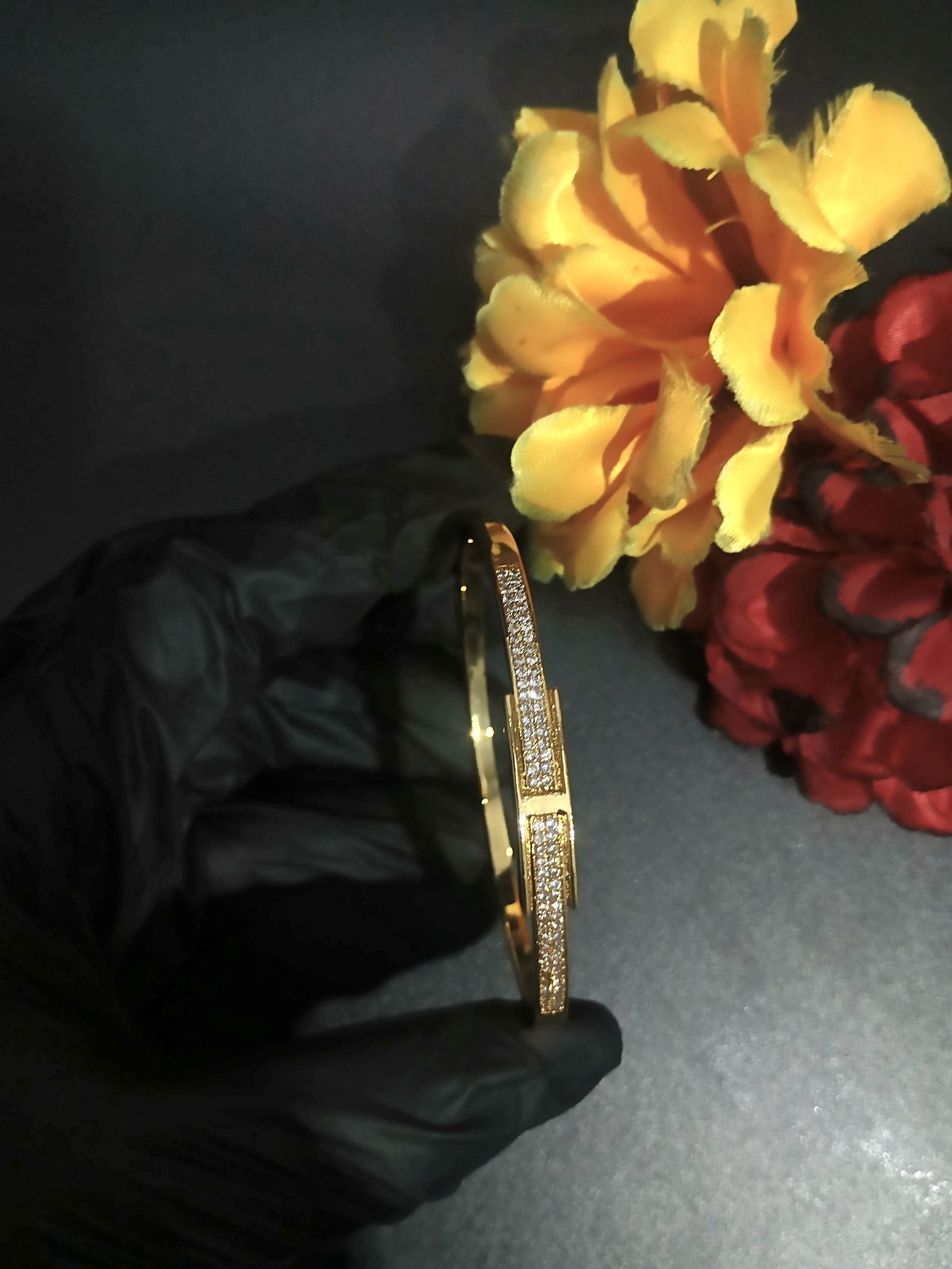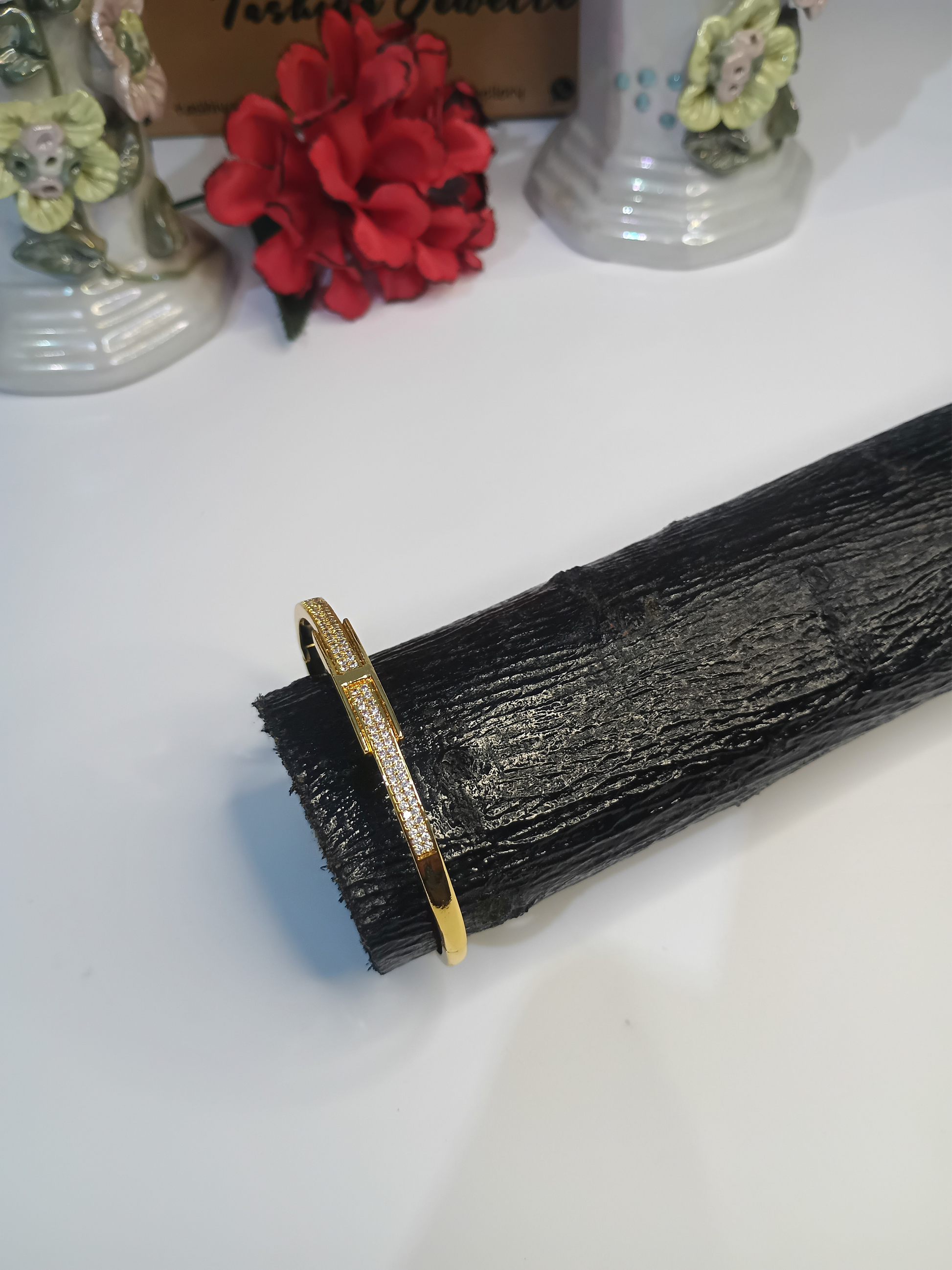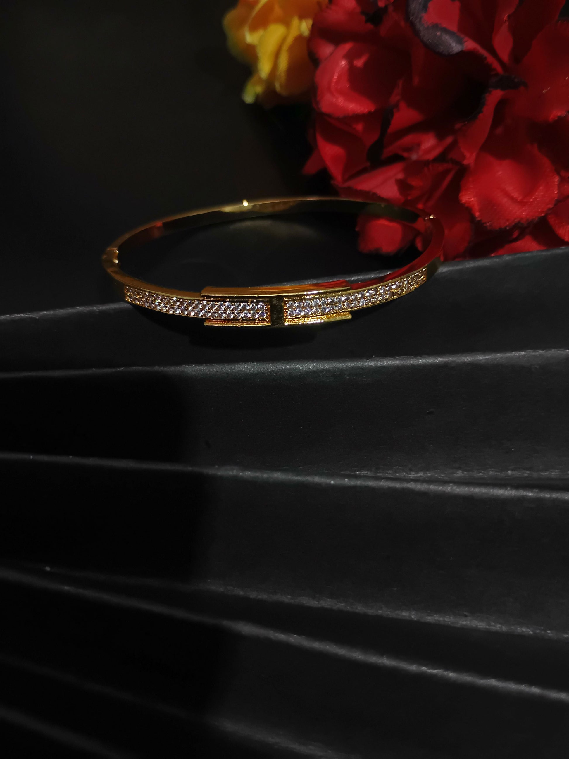 Elegant and eye-catching, this openable gold-tone bracelet features a sleek design fully encrusted with shimmering stones and a chic rectangular accent—perfect for adding a touch of glam to any look.