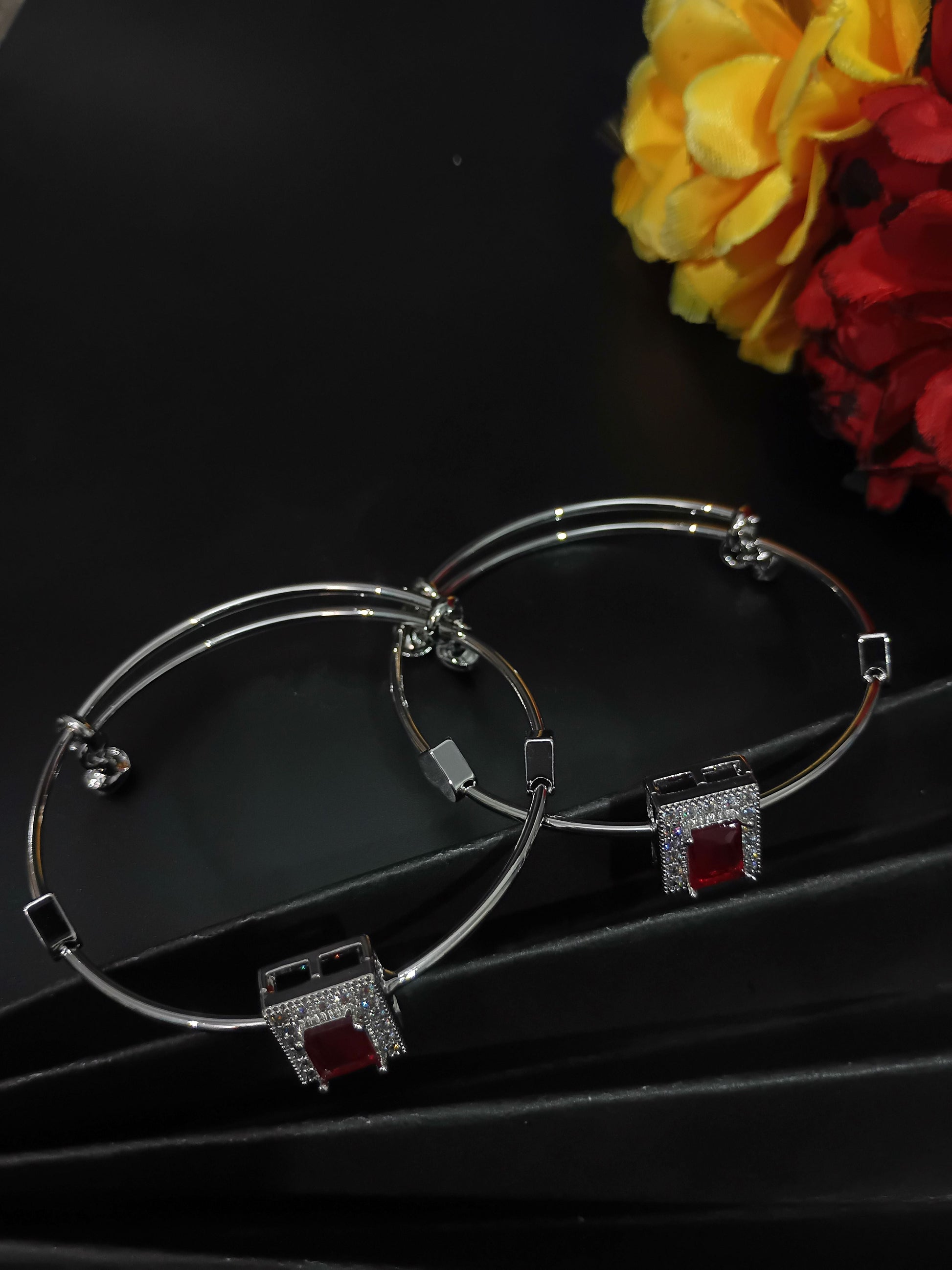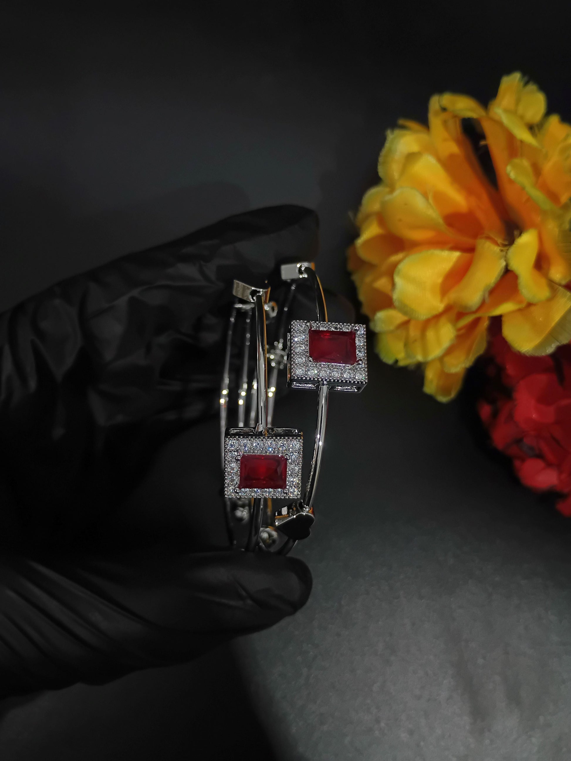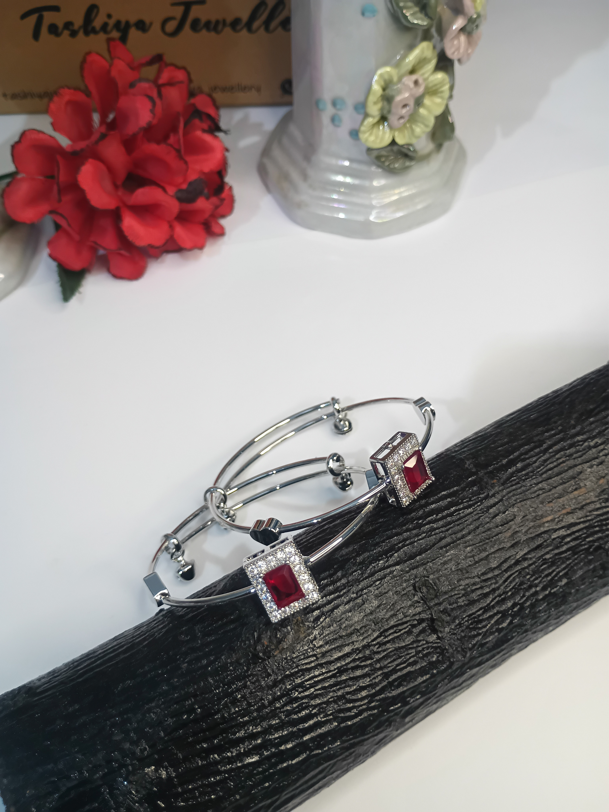 This elegant adjustable bracelet features a sleek silver-tone design with a striking square-cut ruby-red stone at the center, surrounded by sparkling zircon accents. The minimal open bangle style is enhanced with geometric detailing and an easy-to-adjust fit, making it perfect for both everyday wear and special occasions. A beautiful blend of modern elegance and timeless charm.