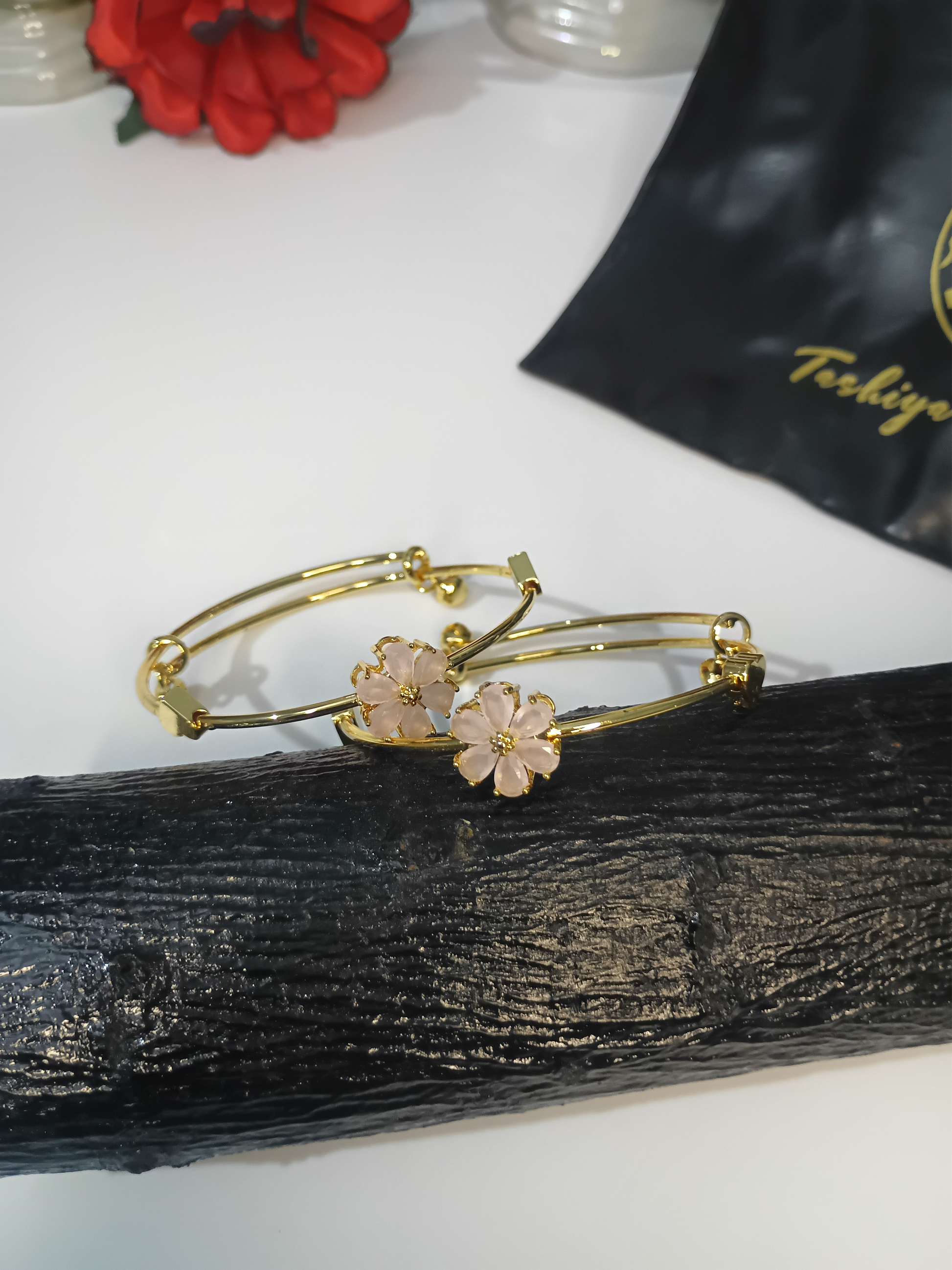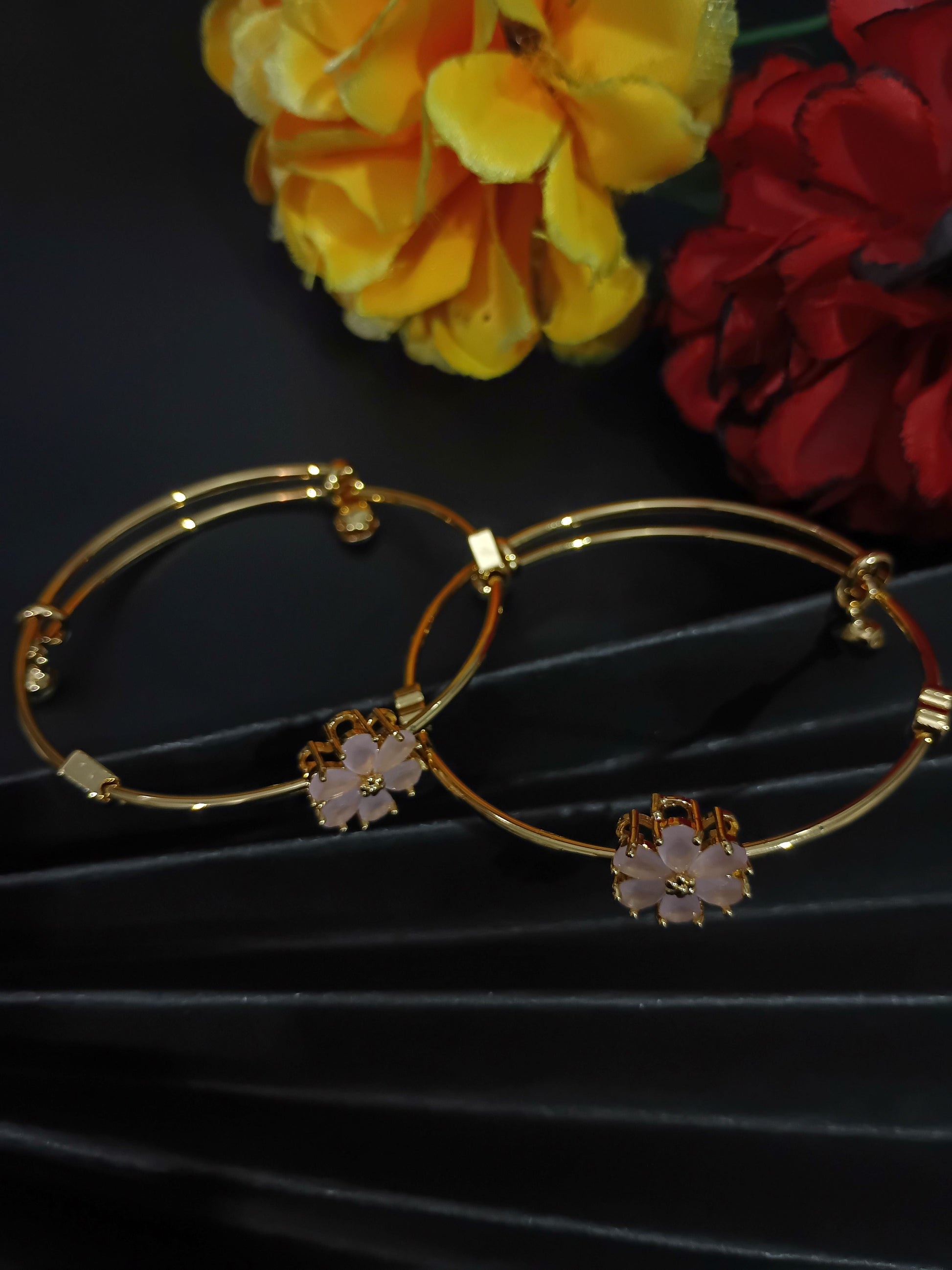 Add a touch of grace to your look with this beautifully handcrafted adjustable bracelet. Designed with a sleek golden finish, this piece features twin flower charms crafted with soft lavender petals and a delicate stone at the center, giving it a subtle yet charming appeal. The double-wire structure enhances both durability and elegance, while the adjustable clasp ensures a perfect fit for any wrist size. Ideal for both casual and festive occasions, this bracelet brings together modern style and timeless floral beauty.