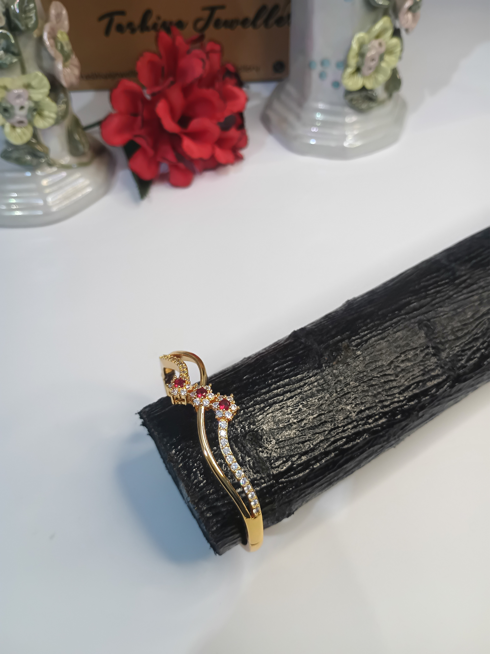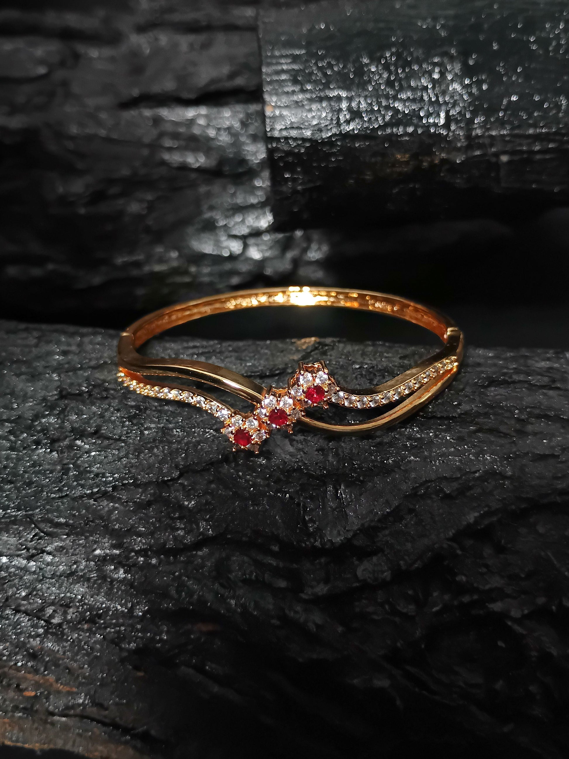 This elegant adjustable gold-tone bracelet features twin curves adorned with sparkling white stones and three red-centered floral motifs. A perfect blend of modern charm and timeless grace, ideal for any occasion.