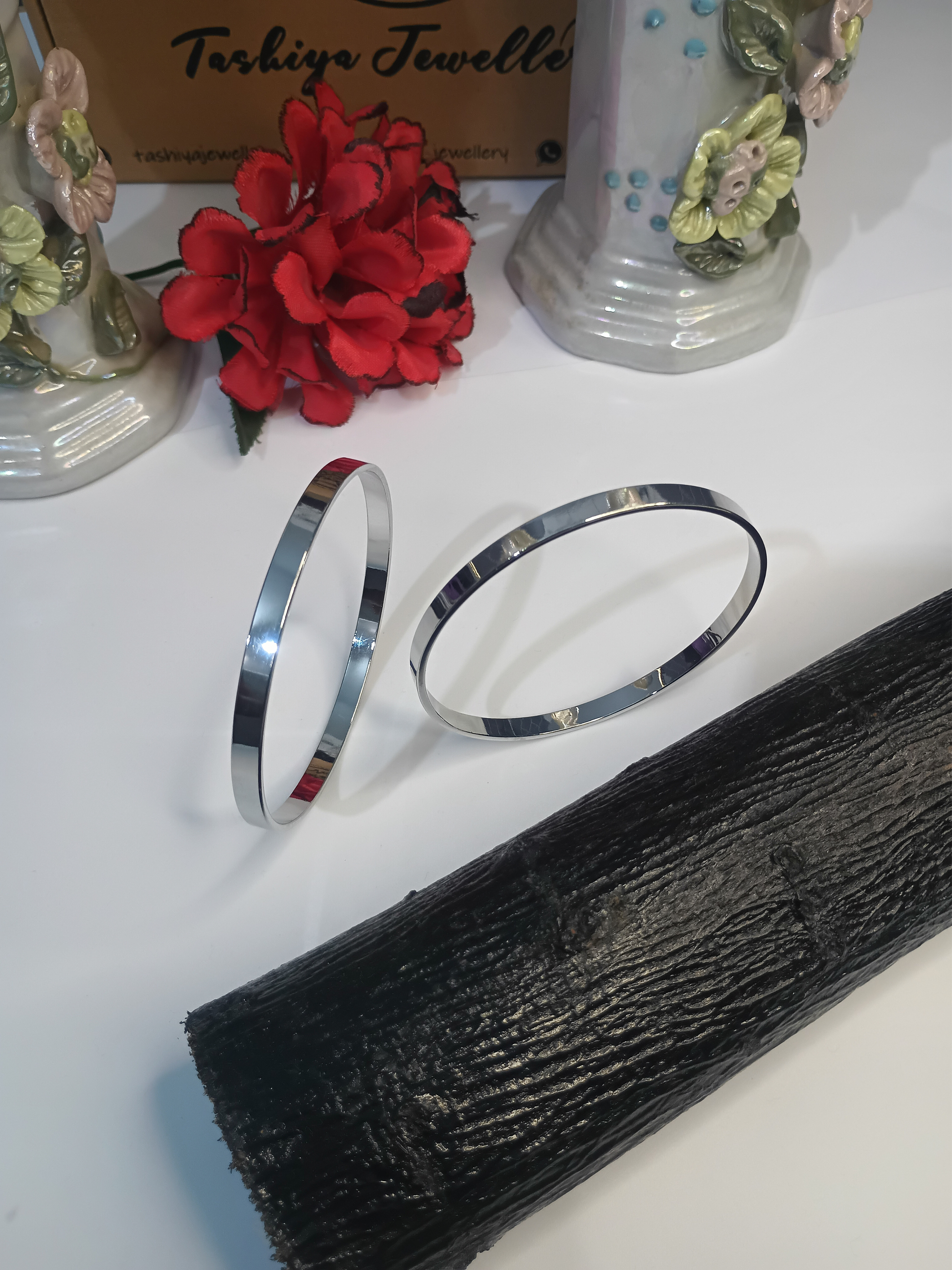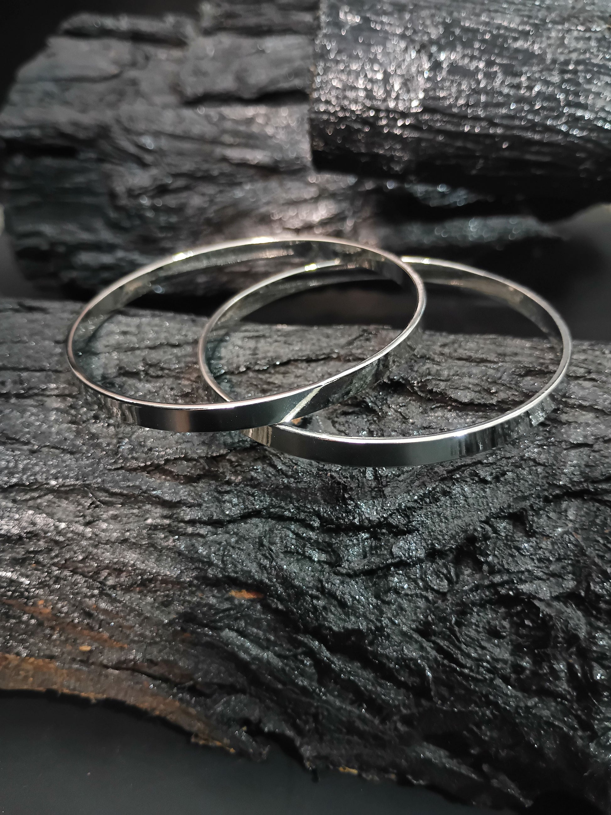 Modern elegance in simplicity—these glossy silver-tone bangles feature a sleek dual-band design, offering a bold yet refined style for everyday wear or special occasions