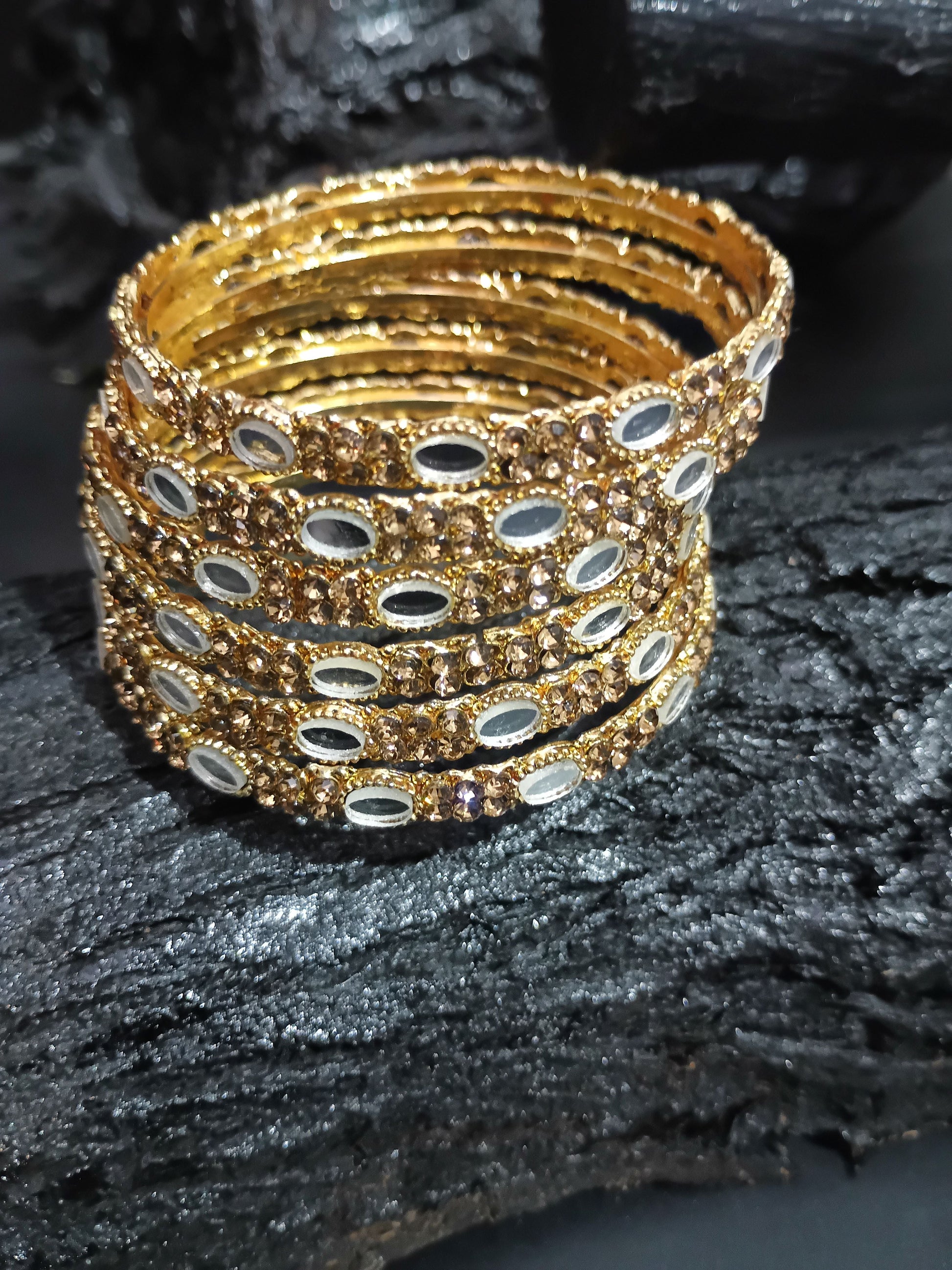 Elevate your traditional elegance with this stunning set of handcrafted bangles by Tashiya Jewellery. These luxurious bangles feature a radiant gold-toned base adorned with two rows of finely set champagne-colored crystals that shimmer with every move. The central row is embellished with alternating oval-shaped mirror stones, adding a touch of timeless charm and sophistication.