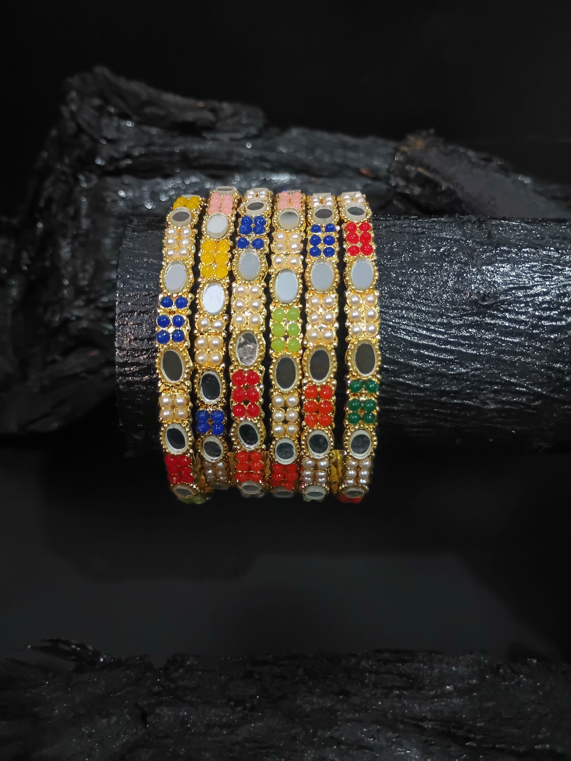 Add a burst of color and tradition to your jewellery collection with these exquisite multicolor bangles handcrafted by Tashiya Jewellery. This vibrant set features a gold-plated base adorned with alternating floral stone motifs and delicate pearl clusters. Each bangle showcases a variety of lively hues—red, blue, green, yellow, orange, pink—making them a perfect match for festive, casual, and cultural wear.