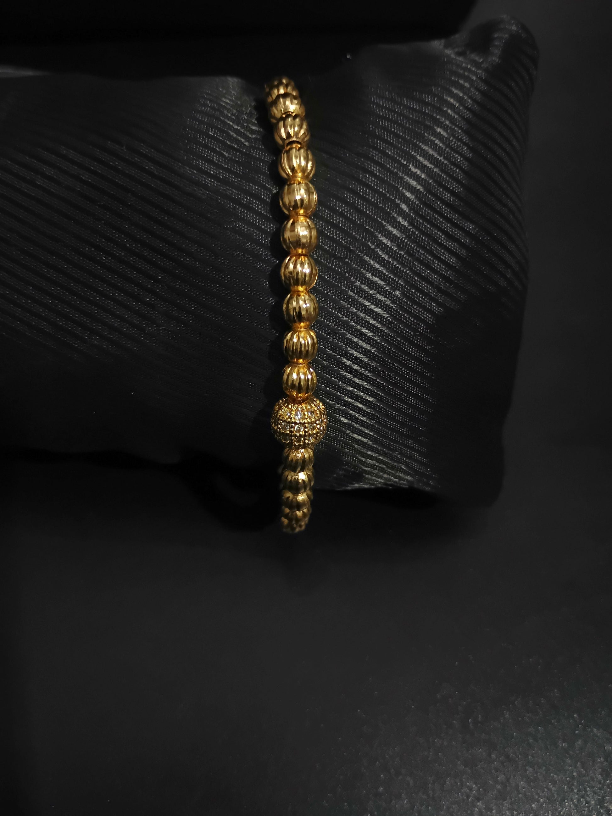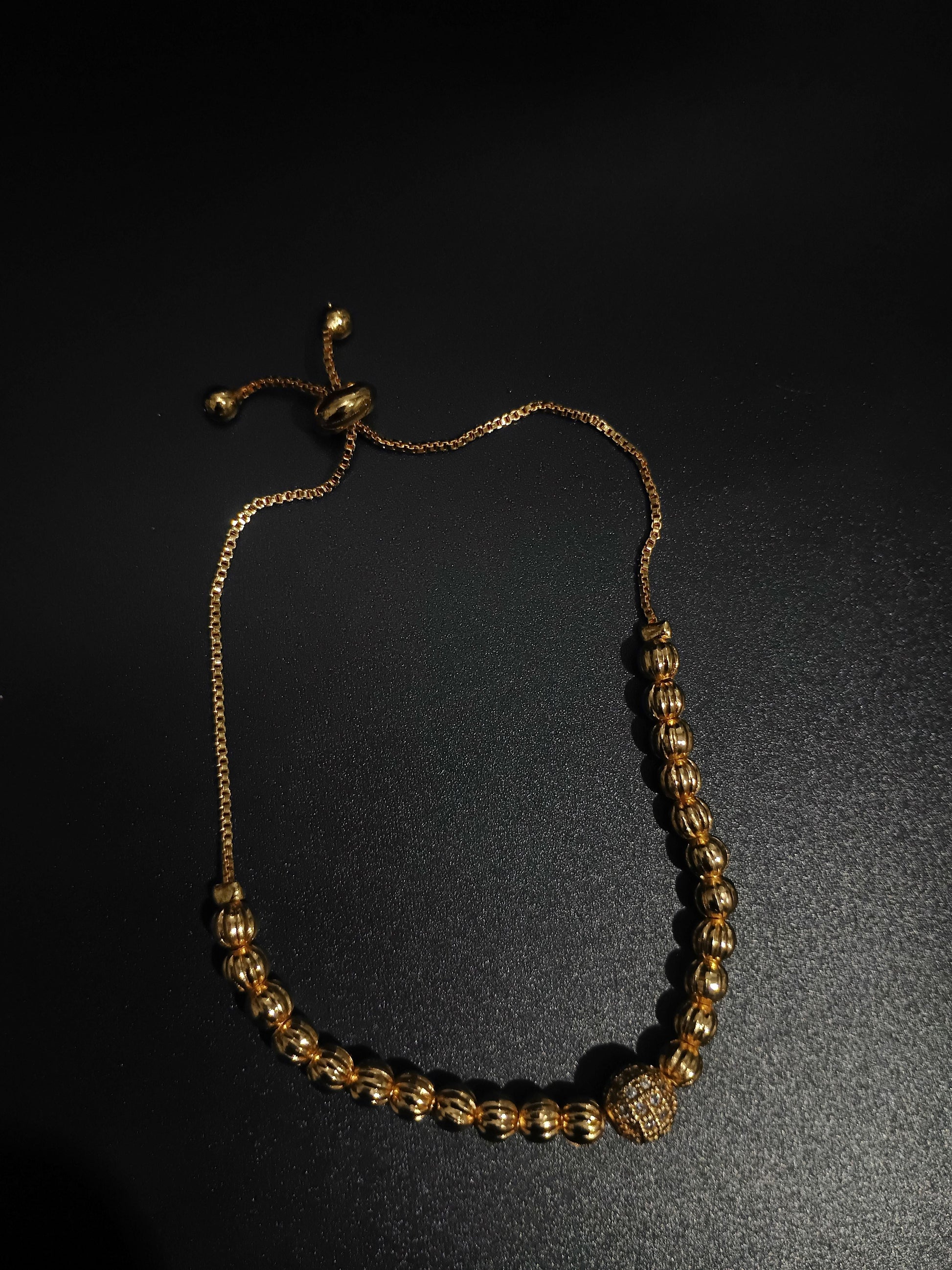Add a touch of charm with this gold beaded adjustable bracelet, featuring a sparkling pave-set charm and a sleek, flexible fit. Perfect for daily wear or special occasions.